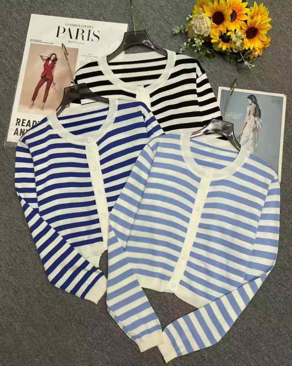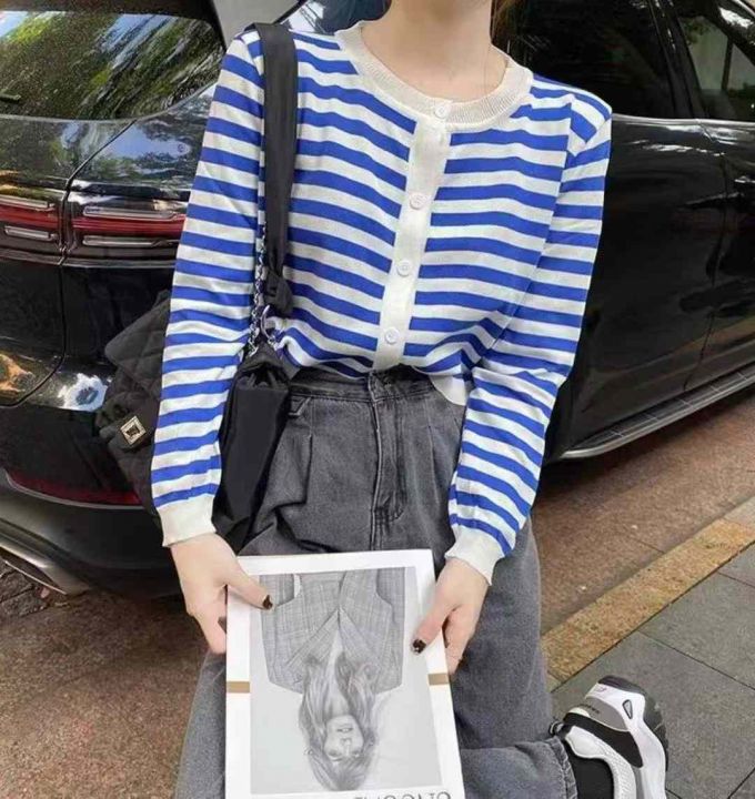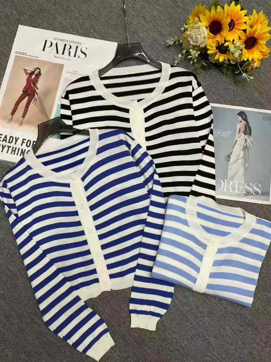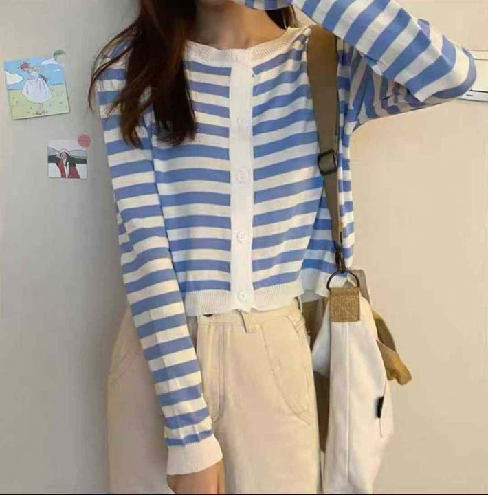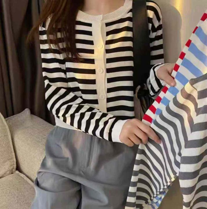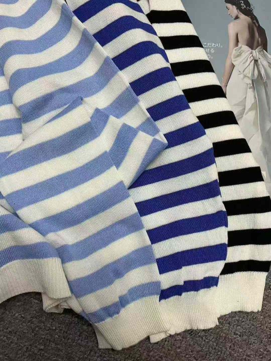 秋季新品撞色条纹百搭短款宽松针织毛衣开衫,独立包装...