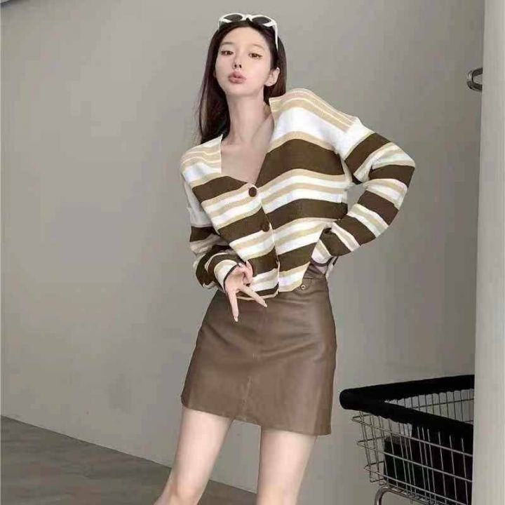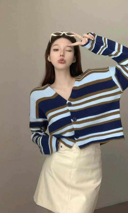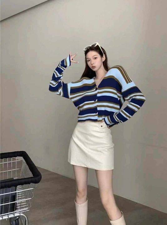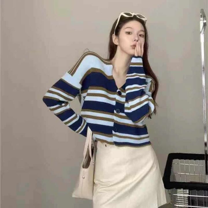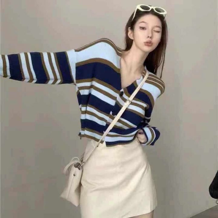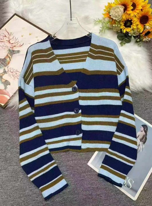 秋季新品软糯撞色条纹宽松慵懒风百搭针织毛衣开衫,独...