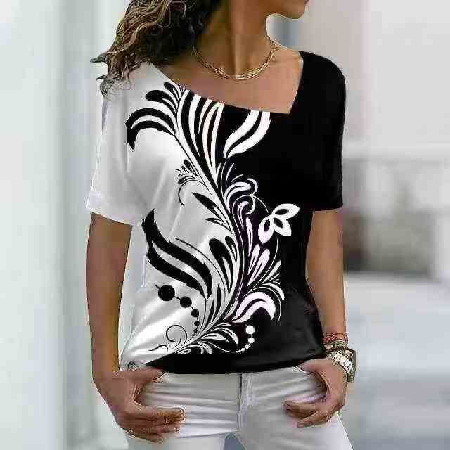 Printed Diagonal Neck Women\'s Short Sleeves印花斜领女式短袖码数:XL-...