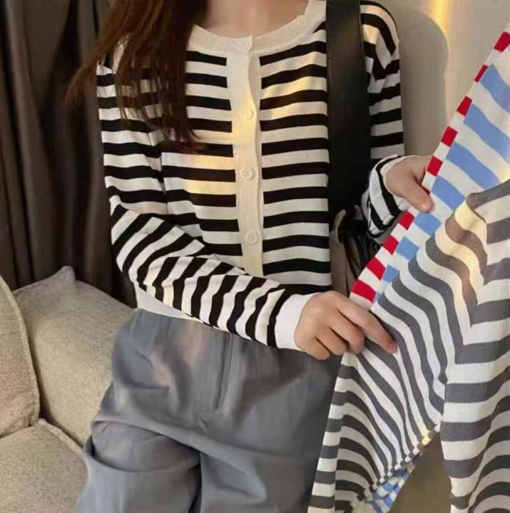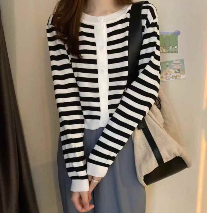 秋季新品撞色条纹百搭短款宽松针织毛衣开衫,独立包装...