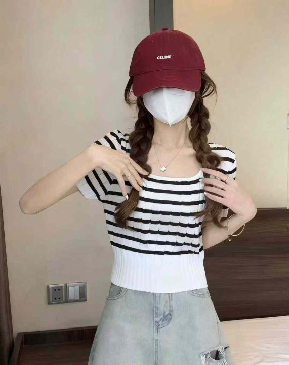 夏季新款撞色条纹甜美方领设计感短袖针织T桖,独立包装,均码面料柔软舒适弹力大,900件,全清5.9元超低价秒杀!分货加一!