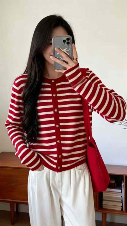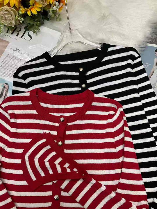 秋冬新款小香风撞色条纹宽松针织毛衣开衫,独立包装,...
