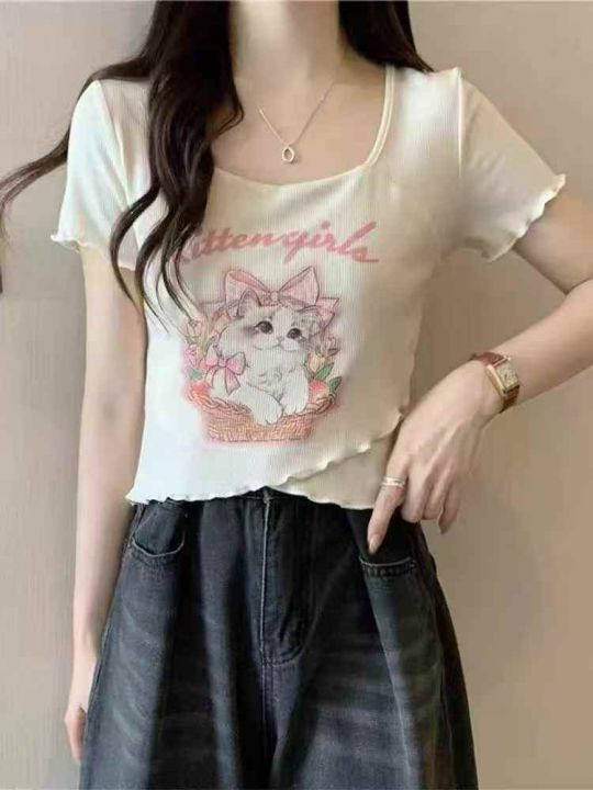 [月亮]:不规则猫咪印花辣妹短袖T恤