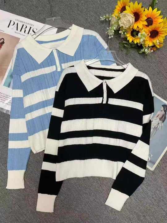 秋冬新款撞色条纹宽松Polo领套头毛衣,独立包装,均码面料柔软舒适弹力大,...