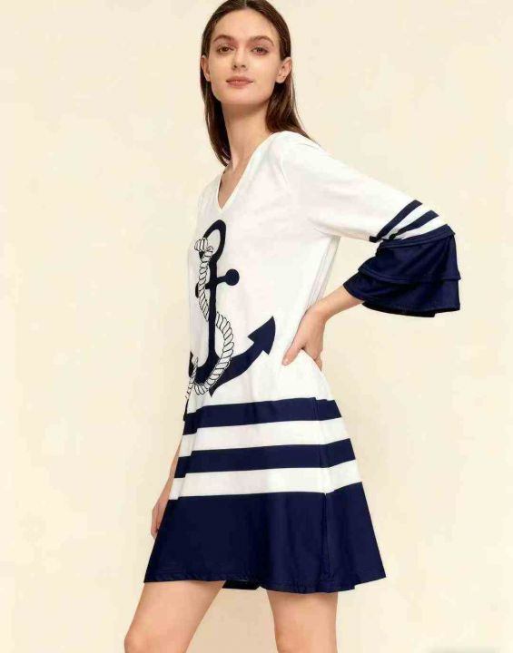 欧美洋气喇叭七分袖印花V领连衣裙 ,领口有包边,品质...