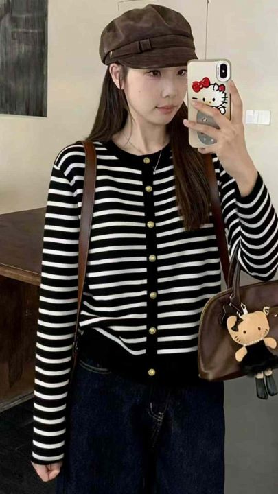 秋冬新款小香风撞色条纹宽松针织毛衣开衫,独立包装,...