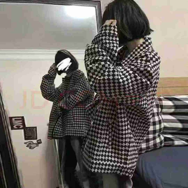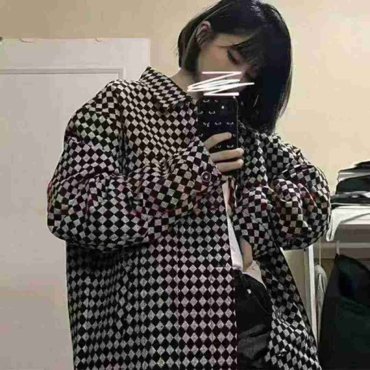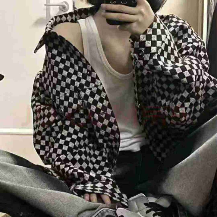 贝吉棋春秋款外套女ins美式复古棋盘格子polo领外套,...