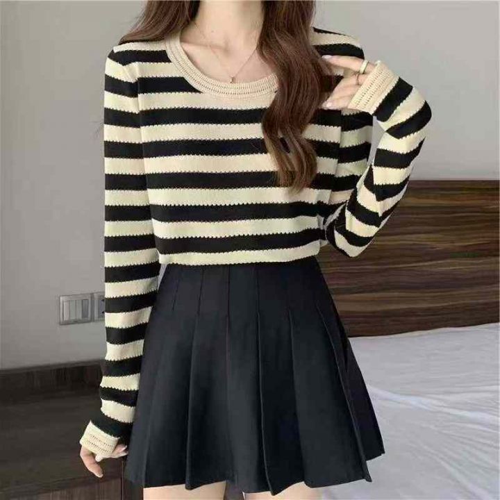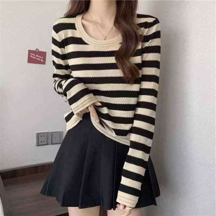 春秋款新品撞色条纹宽松正肩长袖针织衫,独立包装,均...