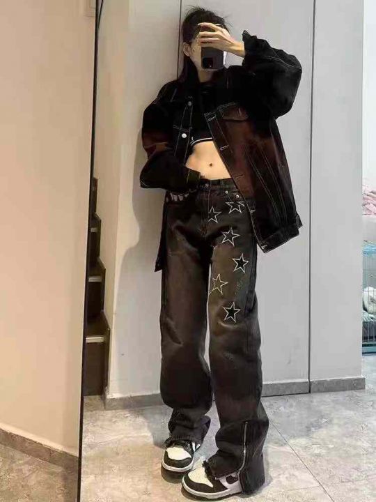 秋冬新款美式高街星星刺绣直筒阔腿复古开叉设计感显瘦牛仔长裤,独立包装带...