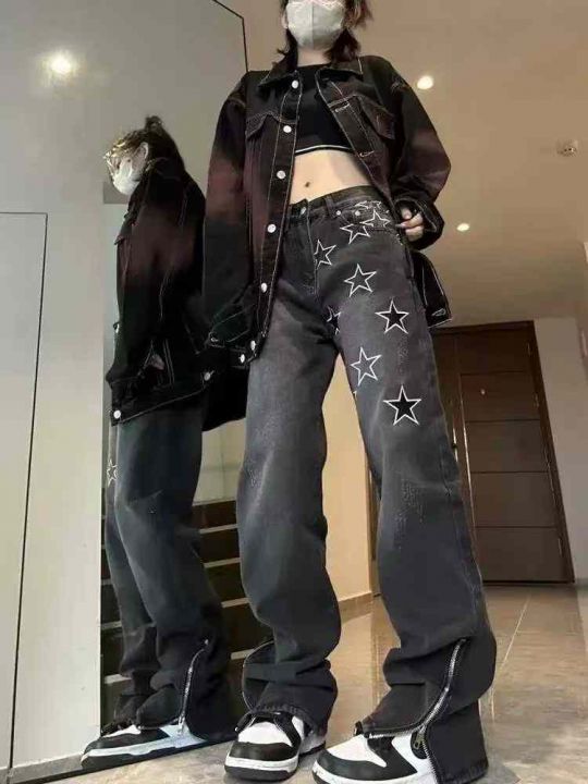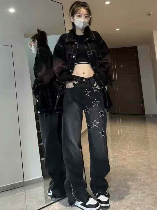秋冬新款美式高街星星刺绣直筒阔腿复古开叉设计感显瘦...