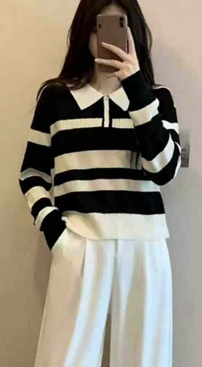 秋冬新款撞色条纹宽松Polo领套头毛衣,独立包装,均码...