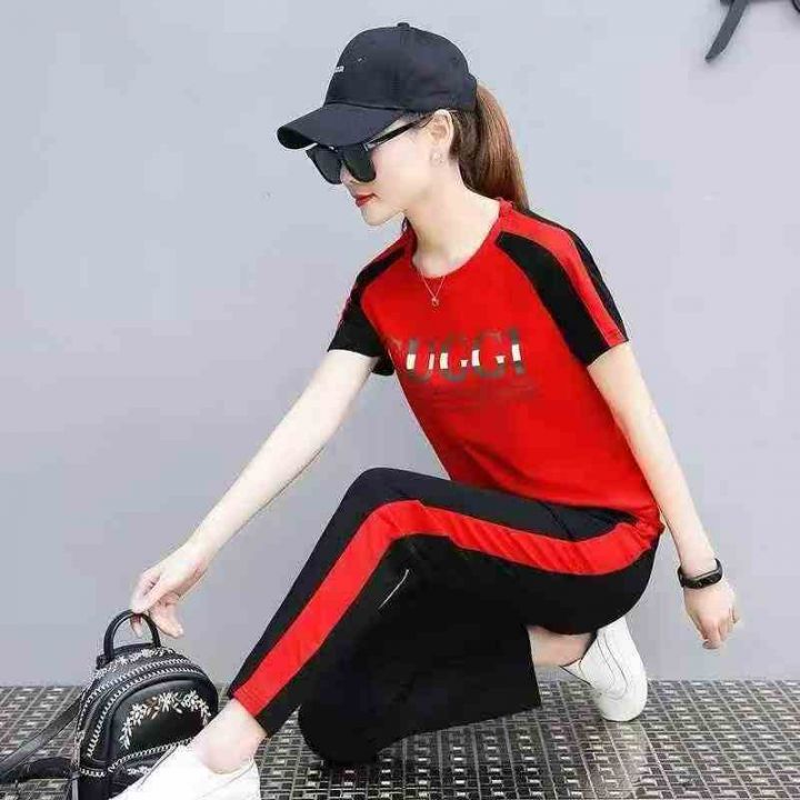 短袖长裤运动套装女夏时尚纯棉宽松跑步服休闲两件套,...