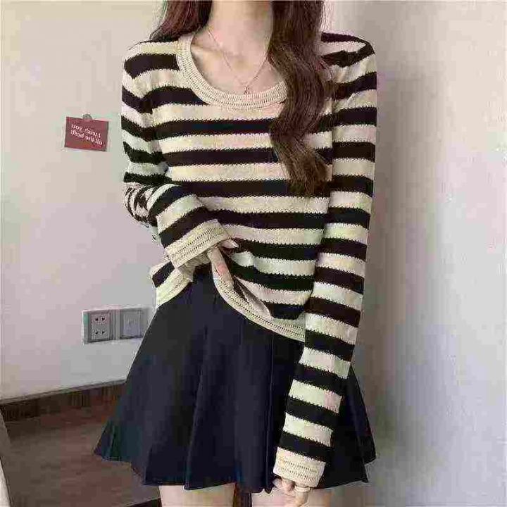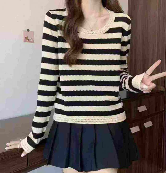 春秋款新品撞色条纹宽松正肩长袖针织衫,独立包装,均...