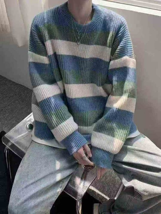 ☆8.8元,秋冬季慵懒风情侣百搭条纹宽松圆领毛衣,男女同款,100件,M-2XL...