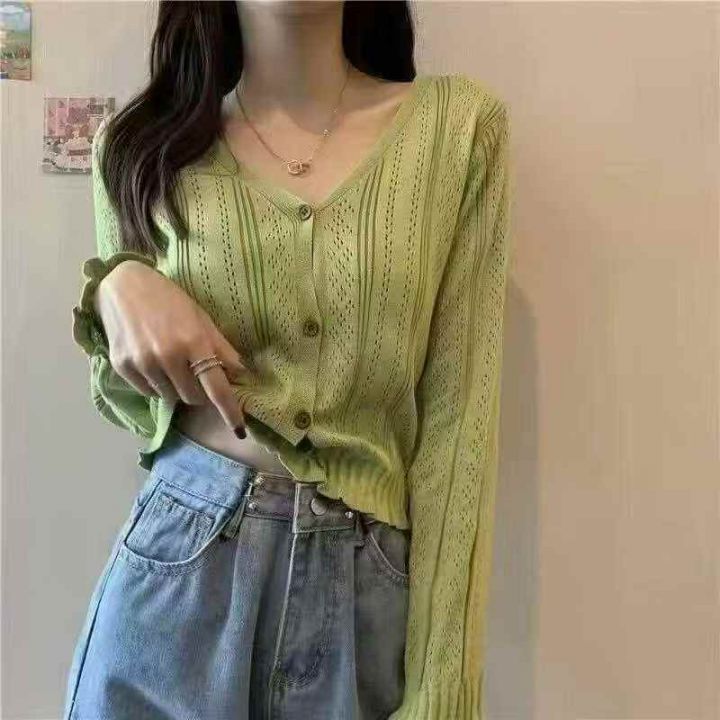捡漏款,秋季新款木耳边设计款韩版V领镂空百搭长袖针织毛衣开衫,独立包装...