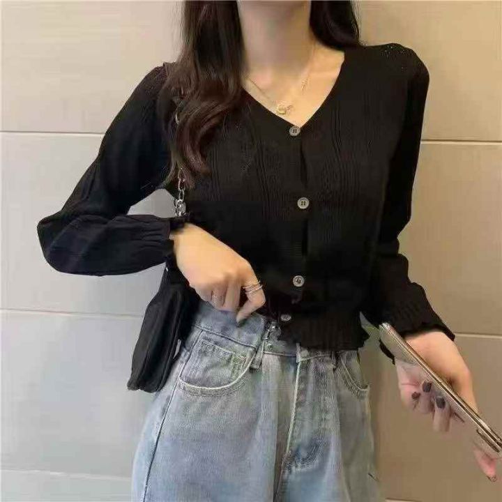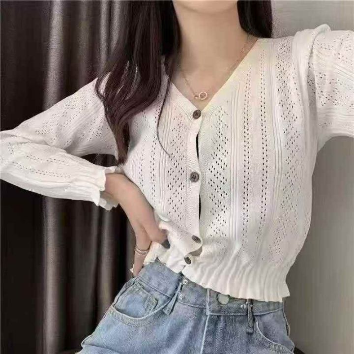 捡漏款,秋季新款木耳边设计款韩版V领镂空百搭长袖针...