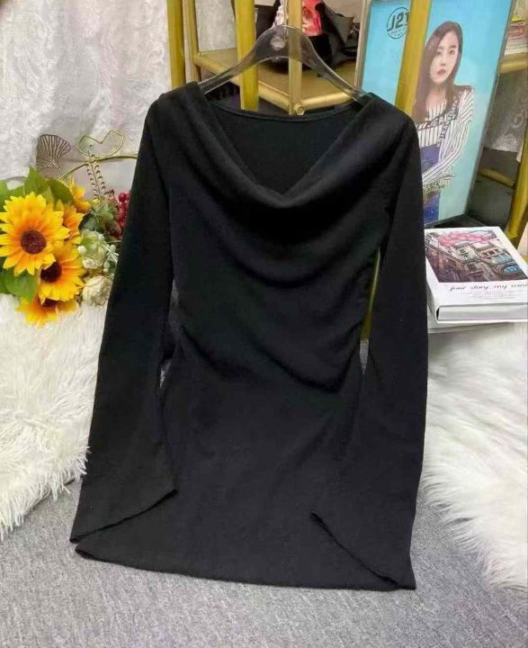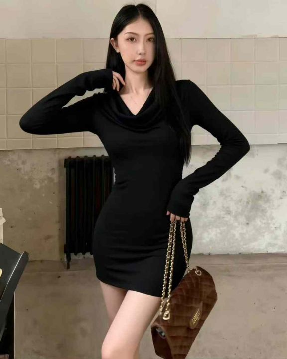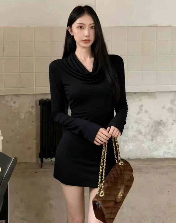秋冬新款女装百搭性感纯欲风弹力修身显瘦荡领德绒连衣...