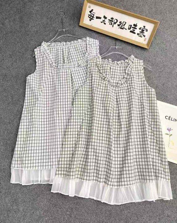韩系复古无袖上衣170件6.9,格子花领口,拼接设计,码...