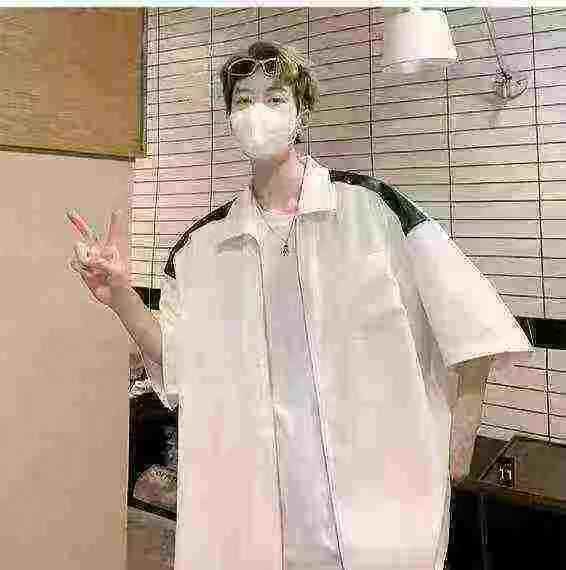 衬衫男夏季小众设计感撞色短袖衬衣美式高街潮牌宽松休闲外套