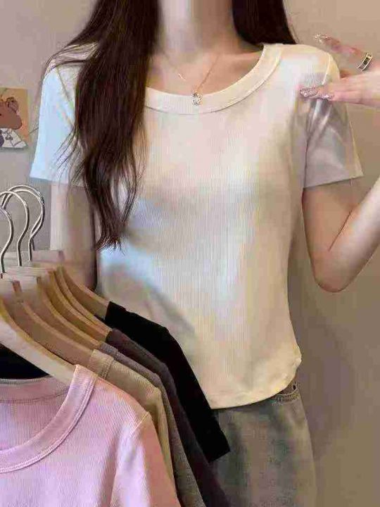 ☕️辣妹T冰感罗纹T恤女短袖夏新款法式修身高弹辣妹短...