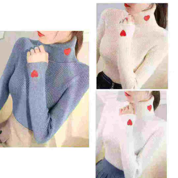 包芯纱气质洋气修身内搭高领半高领毛衣潮爱心刺绣针织打底衫,独立包装,高...