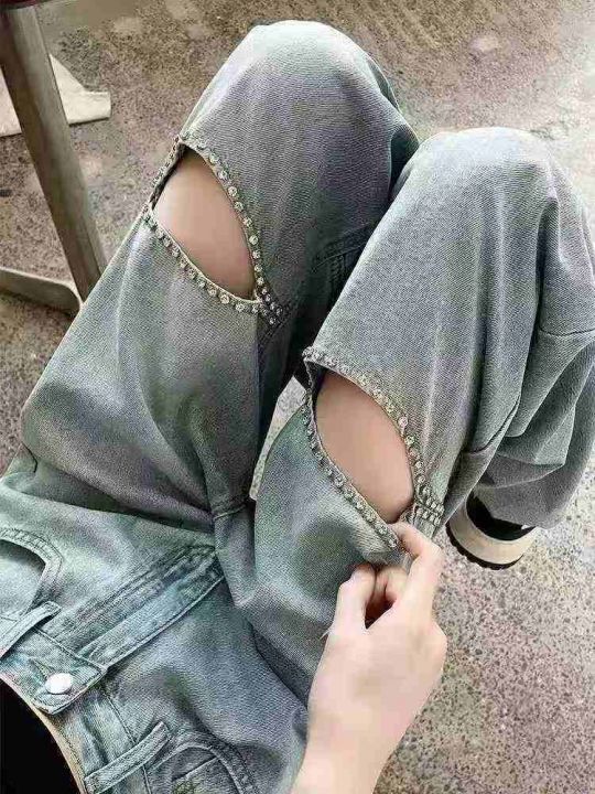 ☕️复古破洞阔腿牛仔裤女秋季宽松小个子设计感拖地裤...