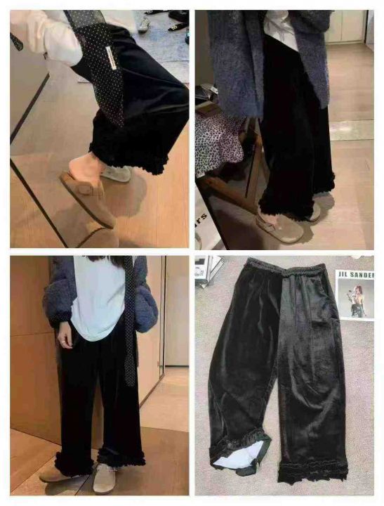 [福]日系宽松慵懒黄金绒阔腿文艺木耳边休闲裤200条左...
