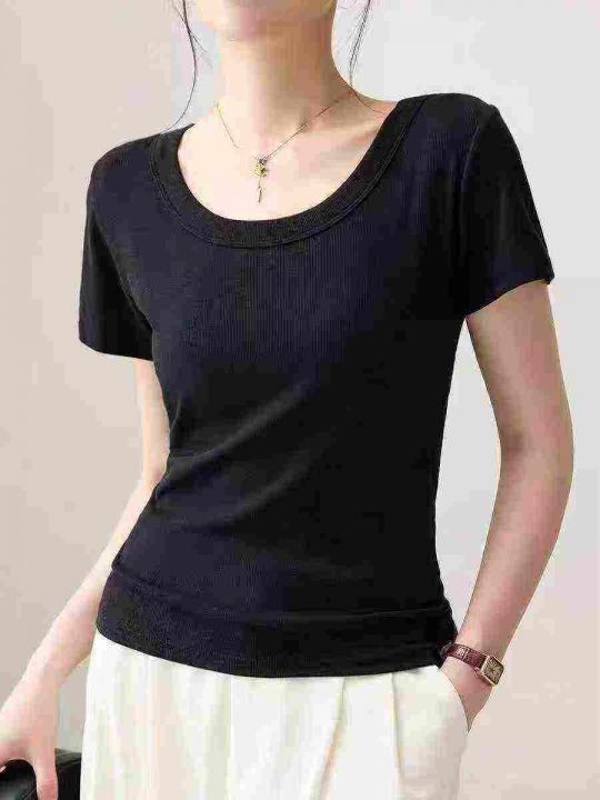 ☕️辣妹T冰感罗纹T恤女短袖夏新款法式修身高弹辣妹短...