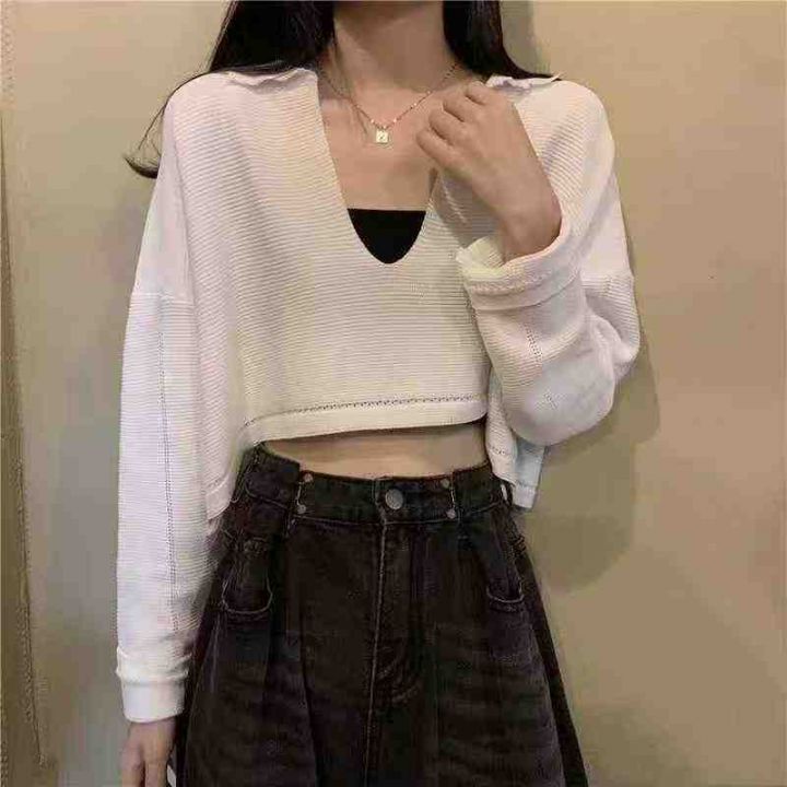 秋季新品法式宽松短款慵懒v领长袖针织衫特+针织抹胸2...