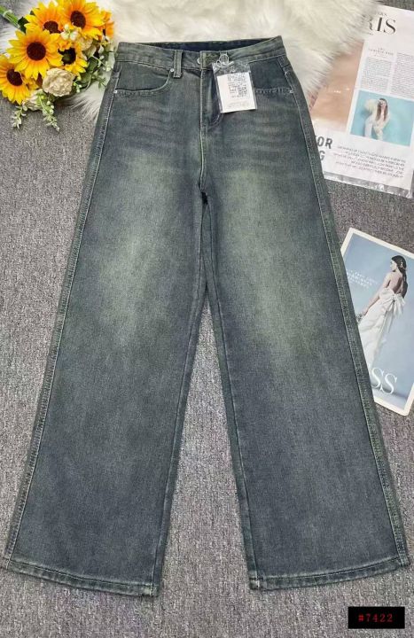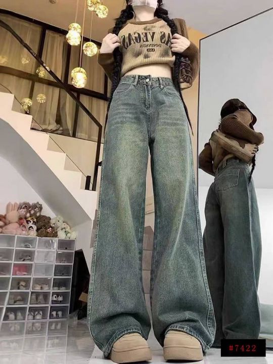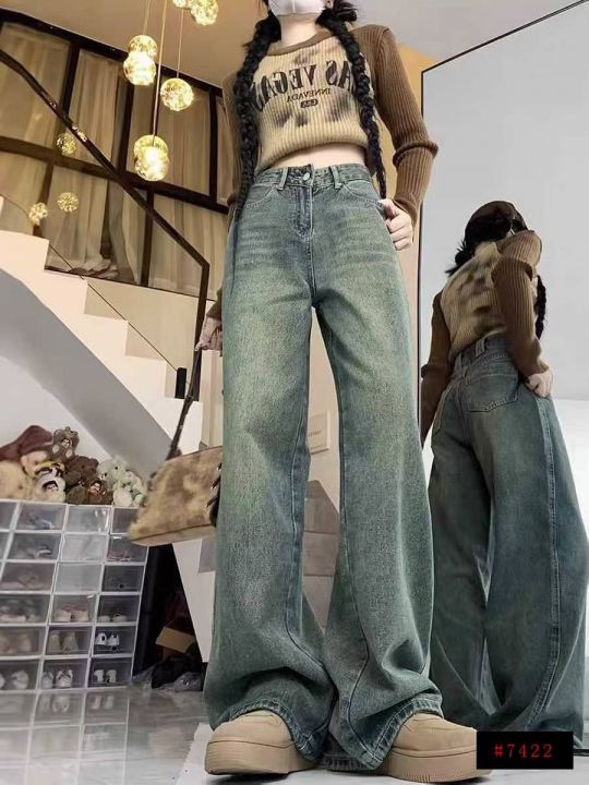 秋冬新款复古蓝水洗棉高腰显瘦垂感直筒阔腿牛仔裤,独...