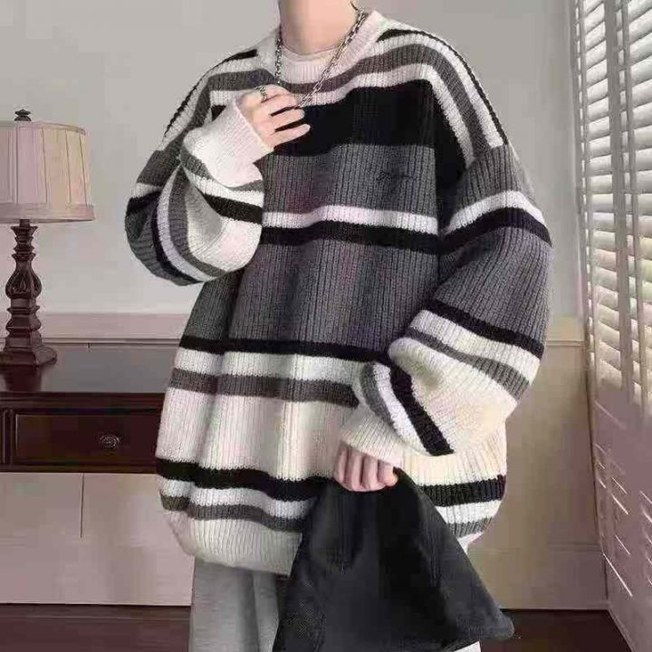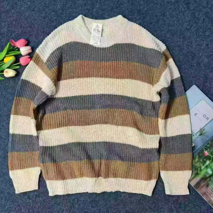 ☆8.8元,秋冬季慵懒风情侣百搭条纹宽松圆领毛衣,男女同款,100件,M-2XL,独立包装吊牌,全清8.8元