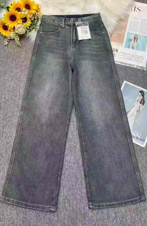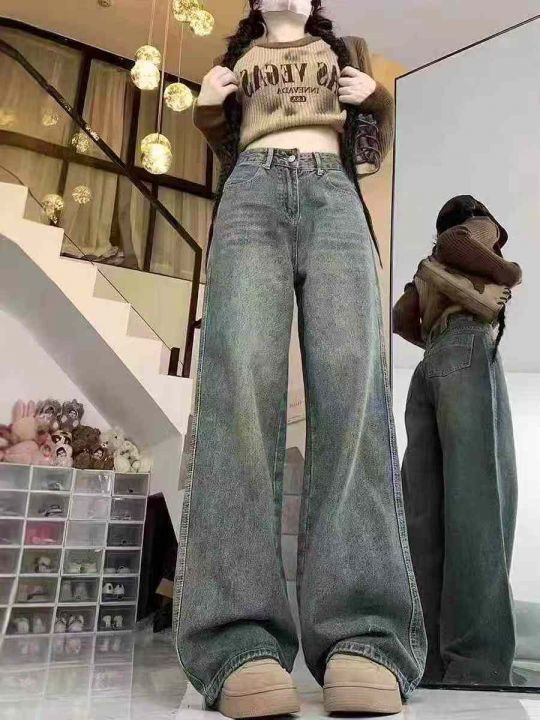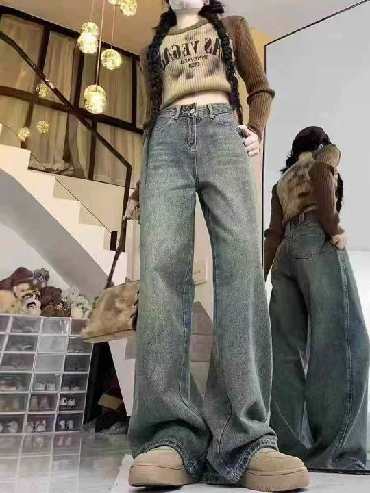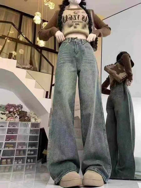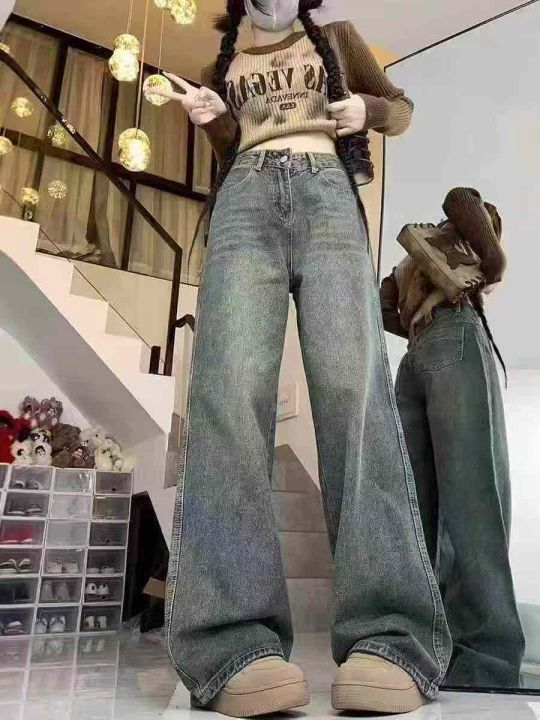 秋冬新款复古蓝水洗棉高腰显瘦垂感直筒阔腿牛仔裤,独...