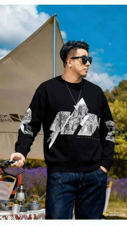秋冬新款男士潮牌宽松慵懒风提花包芯纱圆领套头毛衣,...