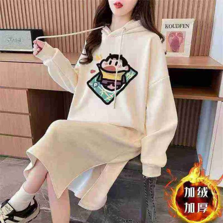 连帽卫衣宽松大码加绒加厚保暖中长款过膝连衣裙外套,...