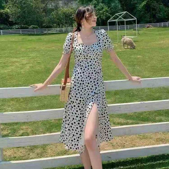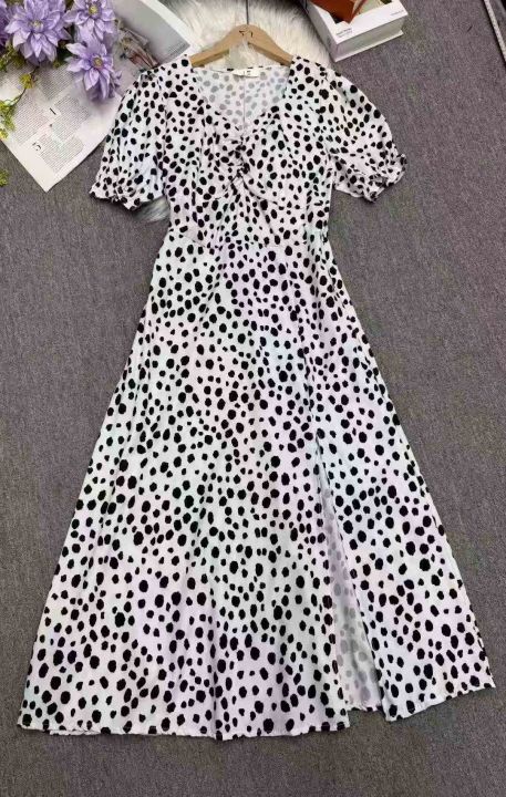 夏装热卖泡泡袖收腰显瘦气质法式复古碎花开叉过膝雪纺中长连衣裙,整款,独立包装,码数L-3XL,L码裙长102厘米,数量207条,(货号0913#41)。 货号:24862