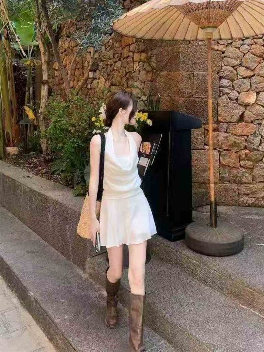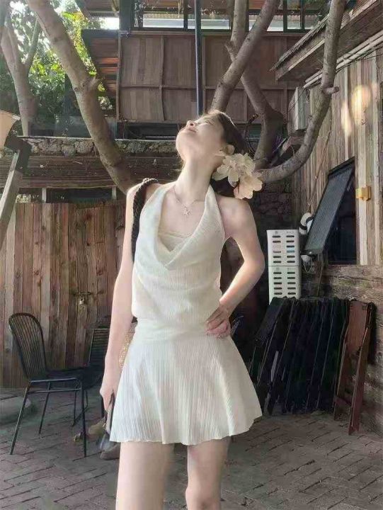 上新全清:11.8一件纯欲风辣妹荡领挂脖褶皱收腰连衣裙...