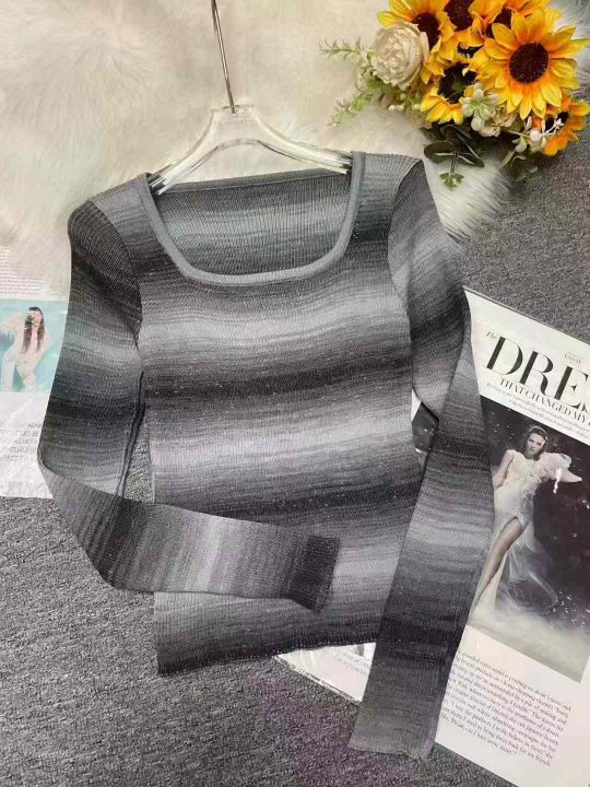 秋冬季新款设计感条纹方领甜辣弹力修身显瘦针织套头毛衣,独立包装,均码面...