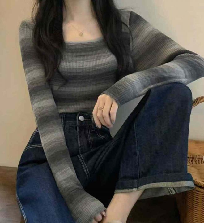 秋冬季新款设计感条纹方领甜辣弹力修身显瘦针织套头毛...