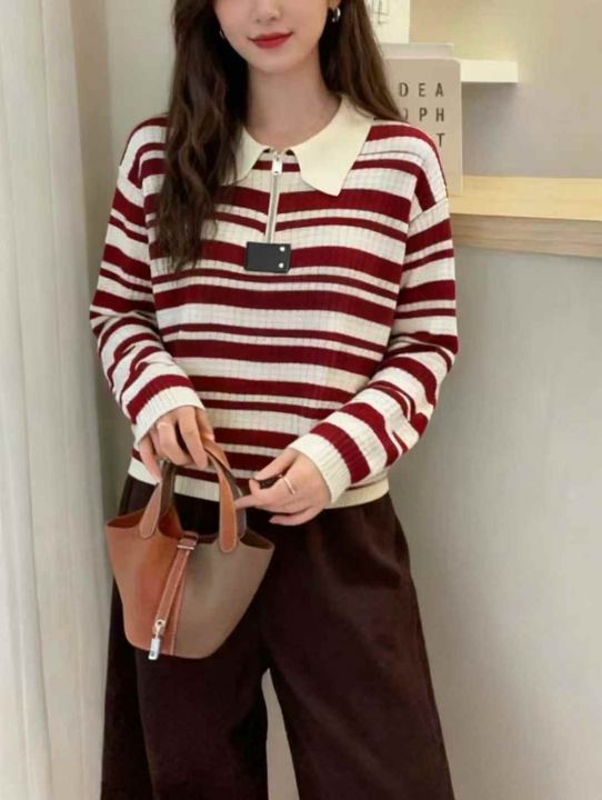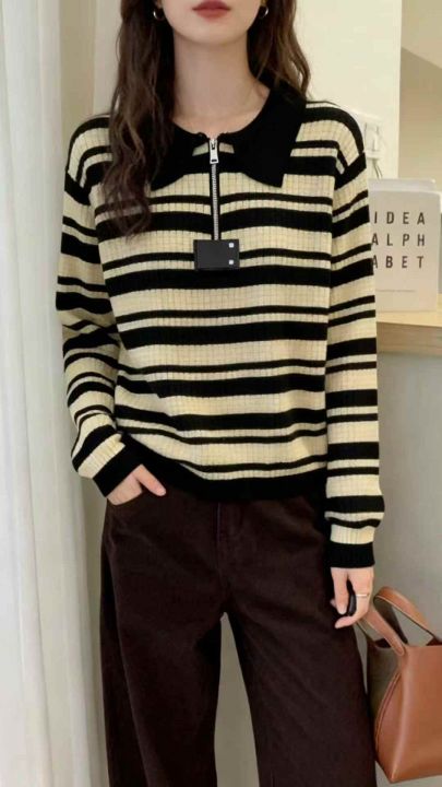 秋冬新款撞色条纹半拉链针织套头毛衣,独立包装,均码...