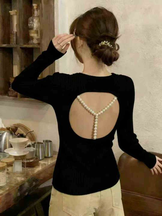 秋季新款设计款后背珍珠装饰坑条包芯纱套头毛衣,独立...
