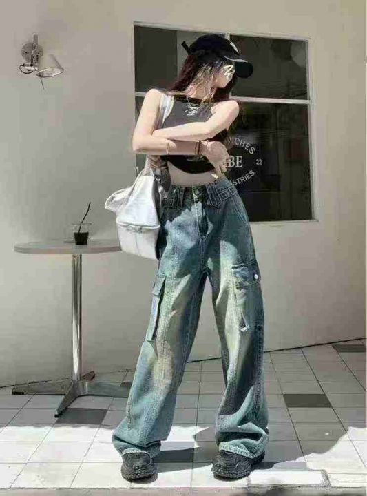 美式复古工装直筒牛仔裤女秋季宽松高腰显瘦水洗阔腿裤...
