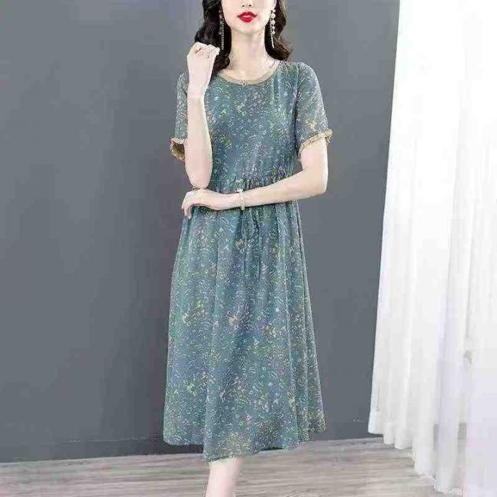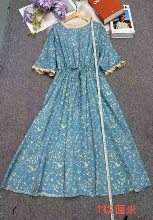 雪纺系带收腰气质显瘦减龄印花过膝连衣长裙,独立包装,码数2-7码,数量234条,5码裙长112厘米,货号121#1