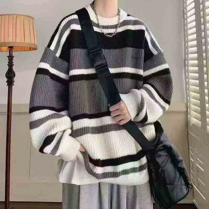 日系复古毛衣男款秋冬撞色打底衫线衣加厚潮牌宽松针织衫,独立包装,货品干...