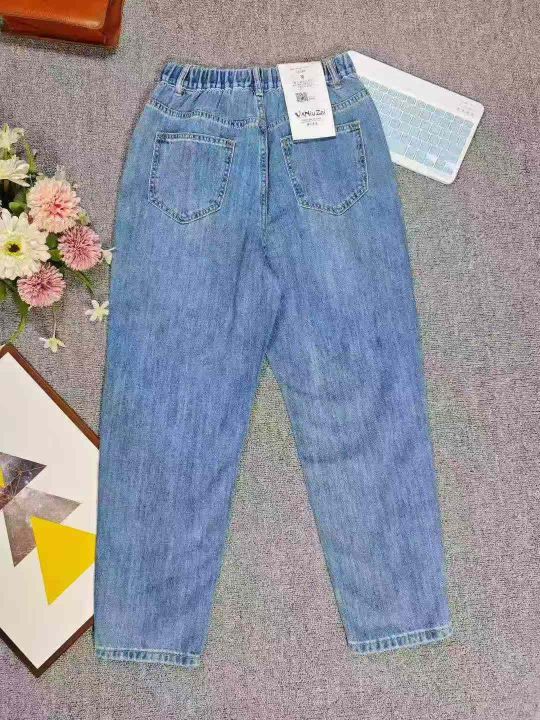 天猫下架洗水棉网红爆款松紧腰哈伦牛仔老爹裤,独立包装带吊牌带防伪扣,码数S--2XL码,900件左右,全清10.9元超低价秒杀!分货加一