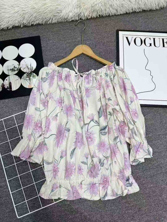 夏季欧美一字上衣泡泡夏季新款印花碎花雪纺衫甜美法式衬衫,独立包装,码数S-5XL,数量233件,全清4.5元。 货号:1323