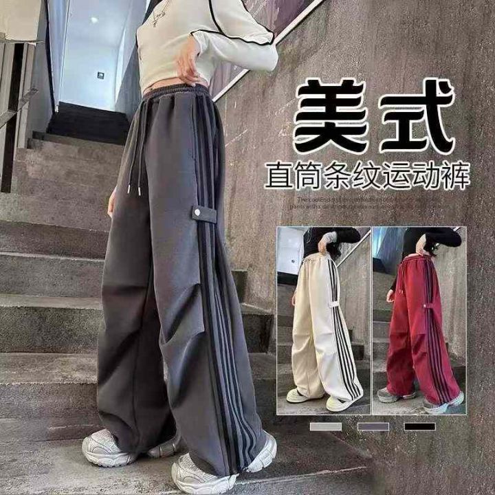 秋冬加绒美式复古阔腿条纹卫裤直筒宽松休闲工装束脚运...