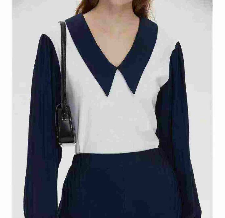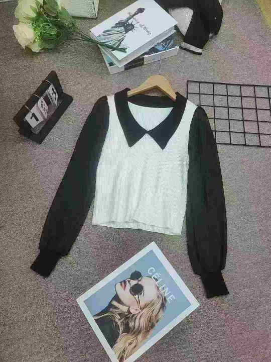 法式衬衫拼接雪纺灯笼袖设计假两件针织衫女新款V领上衣,独立包装,均码,360件,清7.8,分➕1
