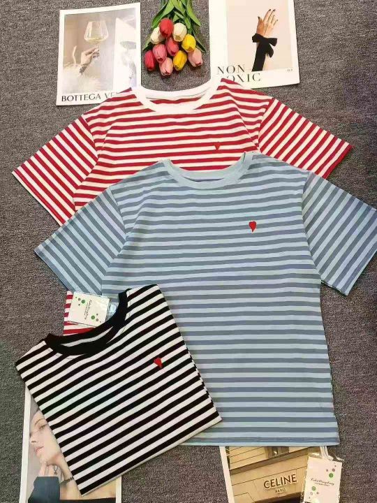 上新全清:6.8一件小众设计感撞色条纹爱心刺绣纯棉宽松T恤,[爱心]100件左...