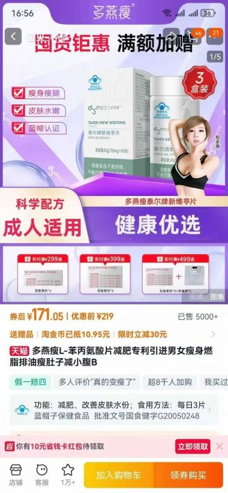 多燕瘦泰尔牌新维亭片(蓝帽子双功效减肥+补水)63克*50,3万盒 2610月,清...