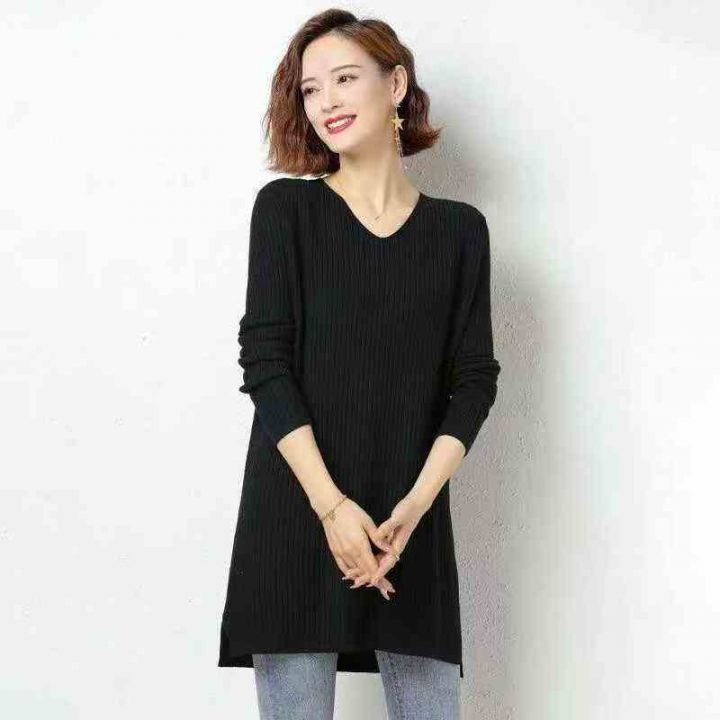 秋冬新款宽松百搭中长款坑条包芯纱2条毛V领套头毛衣,...
